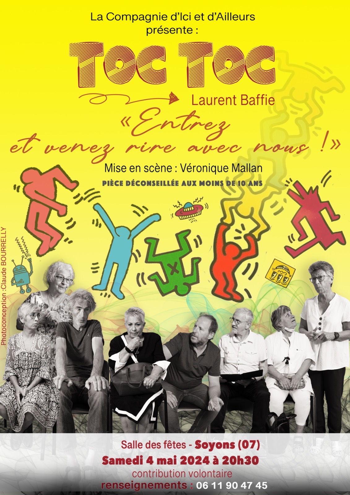 Comme le printemps c’est aussi d’autres bonnes nouvelles à partager et d’autres invitations, nous avons aussi la joie de vous inviter à nous rejoindre le samedi 4 mai 2024, à la salle des fêtes de Soyons, pour la pièce « Toc-Toc », de Laurent Baffie, mise en scène par Véronique Mallan et proposée au profit de notre association par la « compagnie d’Ici et d’Ailleurs », un très très bon moment à partager, du rire en perspective, à 20h30.