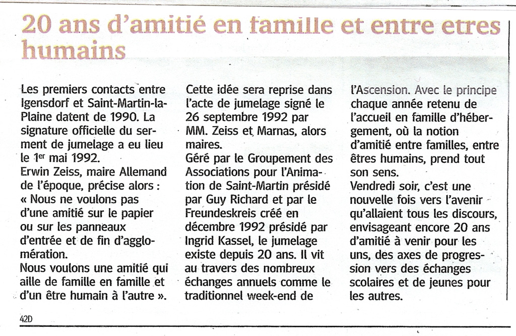 Article du Progrès de Lyon des 20 et 21 mai 2012 relatant les festivités des 20 ans de jumelage entre Igensdorf et Saint-Martin la Plaine