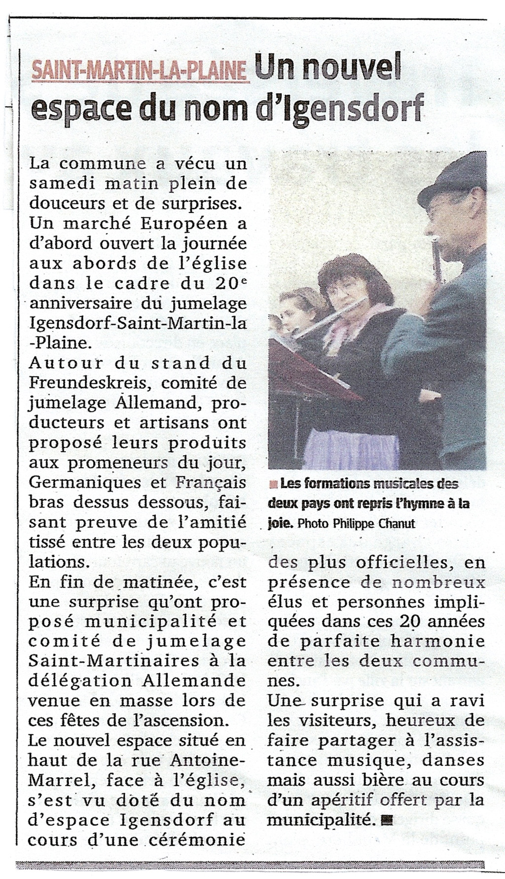 Article du Progrès de Lyon des 20 et 21 mai 2012 relatant les festivités des 20 ans de jumelage entre Igensdorf et Saint-Martin la Plaine