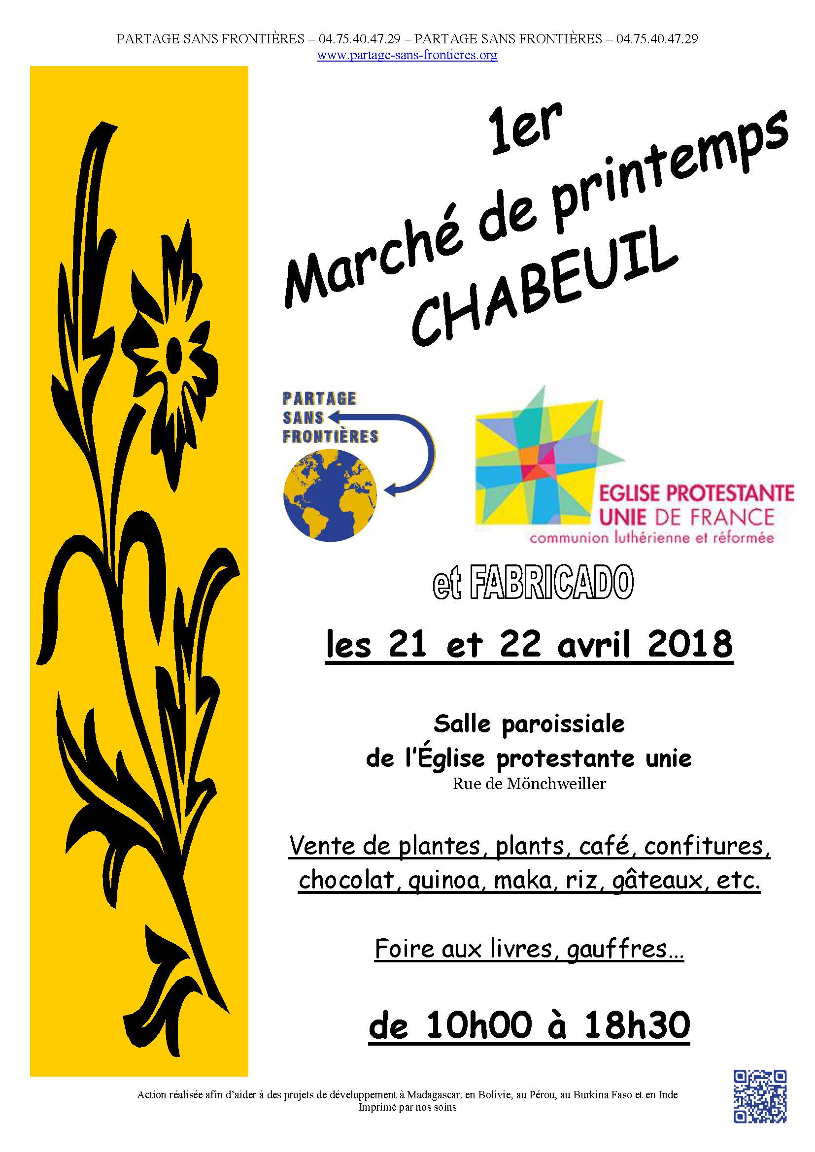 Nous avons le plaisir de vous inviter à nous retrouver pour notre traditionnel marché de printemps. Nous changeons de lieu mais pas d'esprit et c'est dans l'accueil et l'échange que nous nous retrouverons les 21 et 22 avril de 10h00 à 18h30, salle de l'Eglise protestante unie,