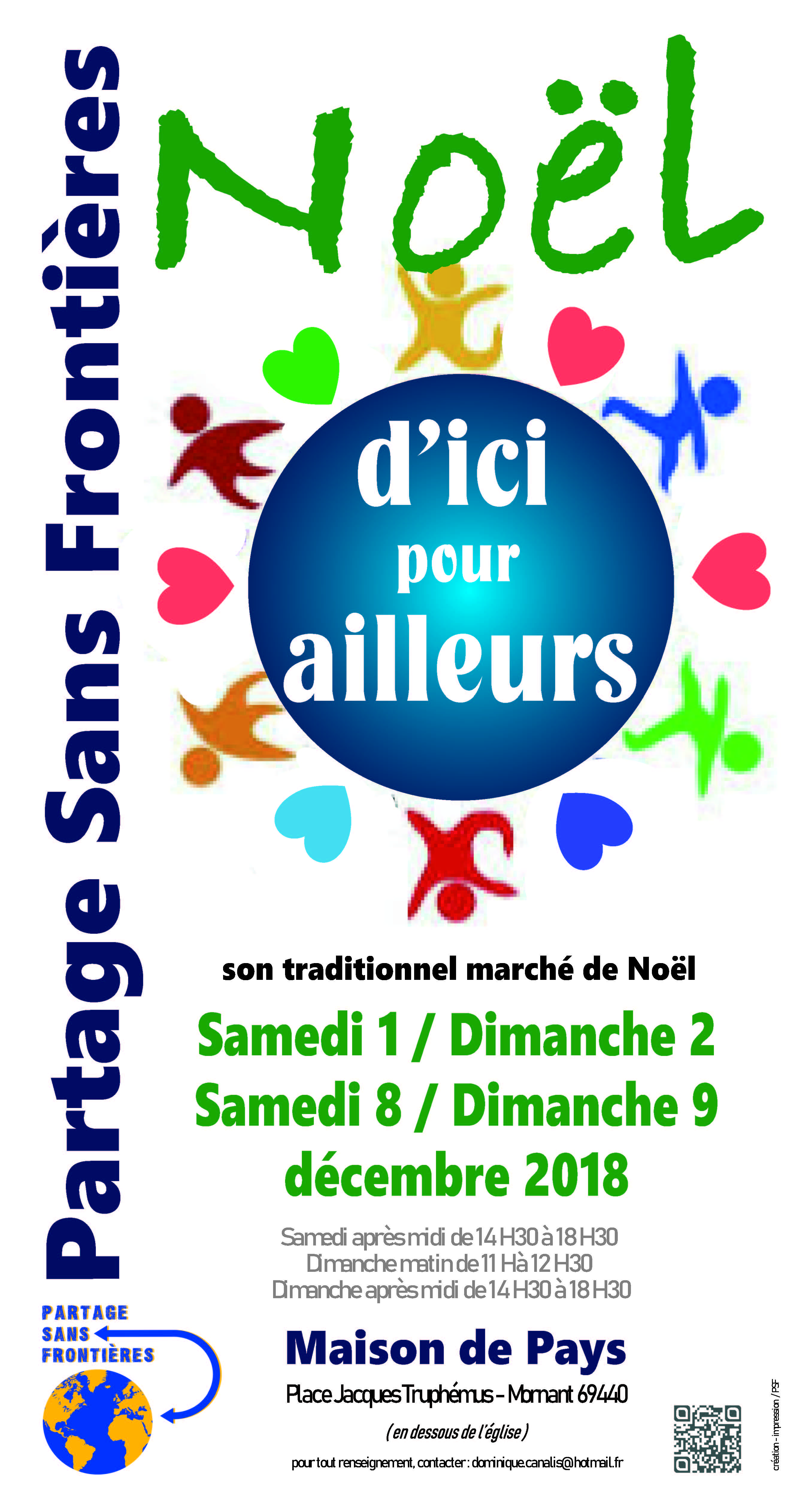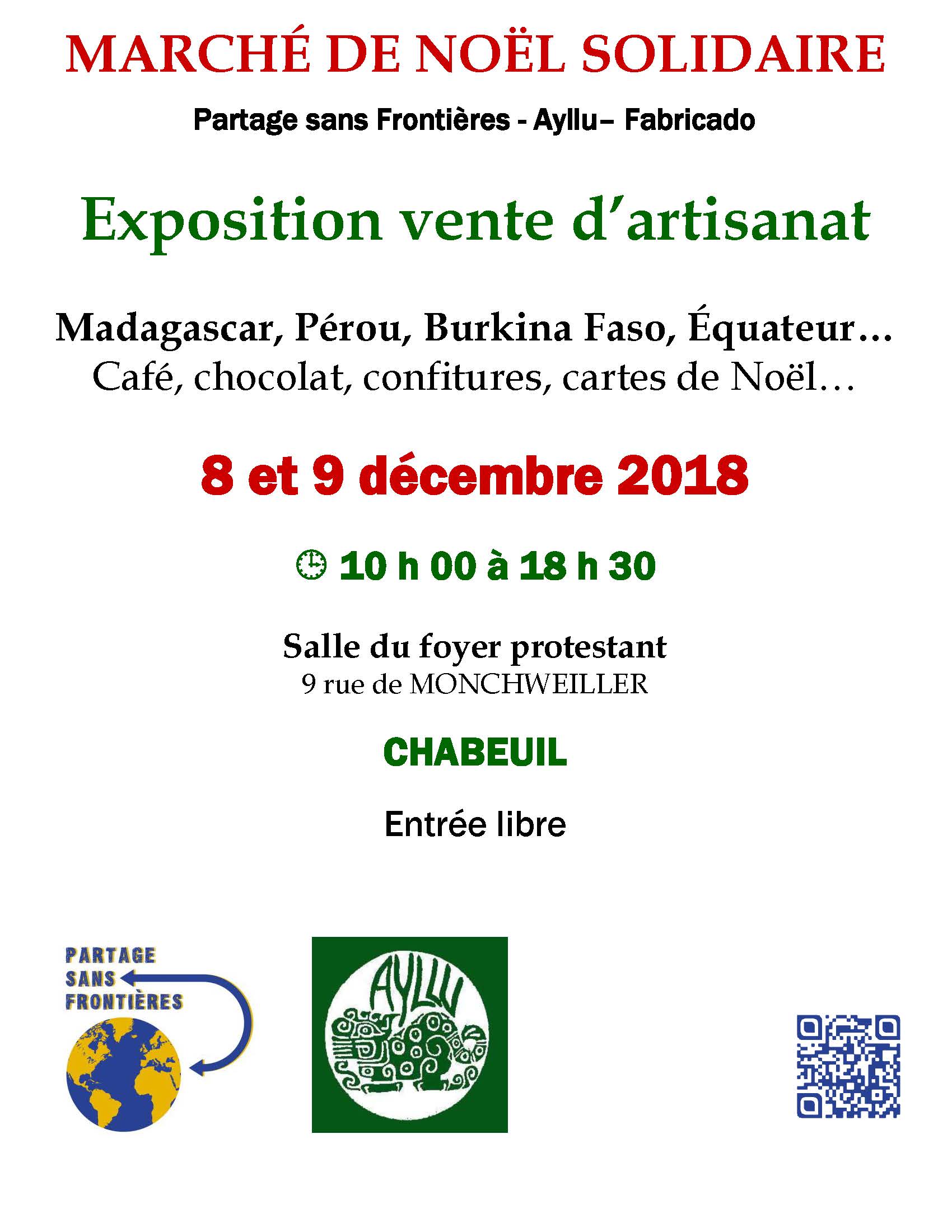 Marché de Noël de Partage sans Frontières les samedi 1er, dimanche 2, samedi 8 et dimanche 9 décembre de 14h30 à 18h30 et les dimanches matins de 11h à 12h30.