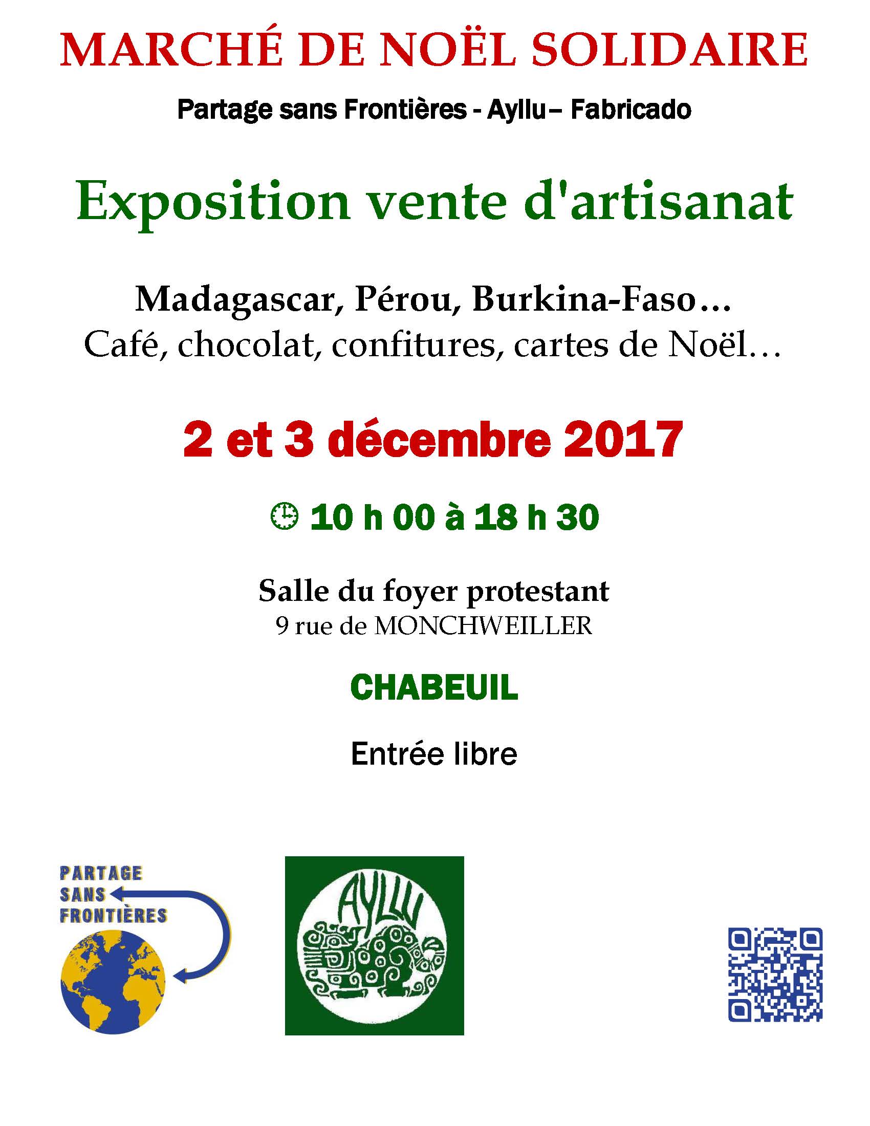 Comme chaque année et ce depuis plus de 20 ans, nous avons le plaisir de vous convier à notre traditionnel marché de Noël avec les associations Fabricado et Ayllu Valence. Nous sommes invités par la paroisse protestante unie de Chabeuil à nous retrouver pour un