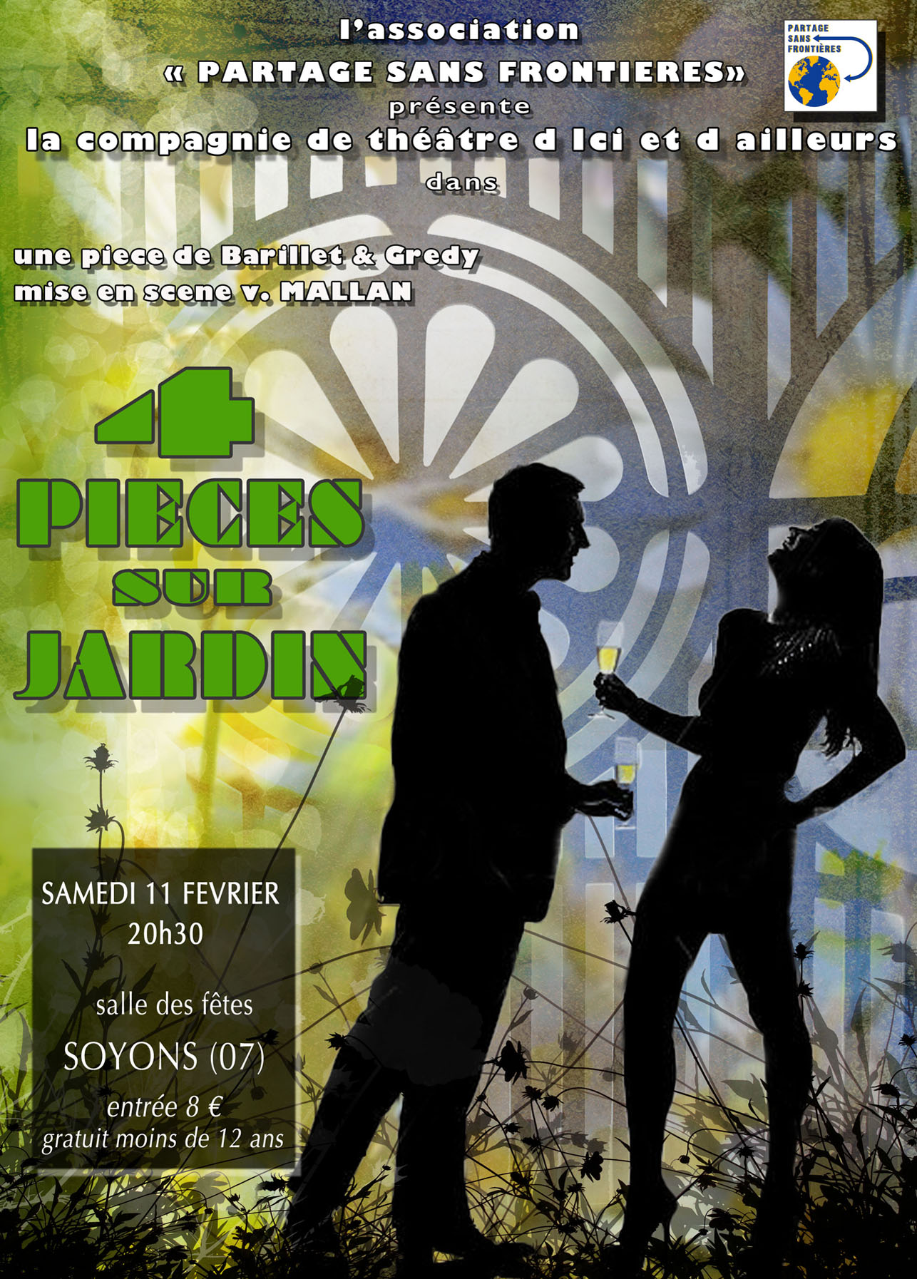 Ouvrir la photo La compagnie "d'Ici et d'ailleurs" a la gentillesse de venir jouer au profit de Partage Sans Frontières leur nouvelle création : 4 pièces sur jardin de Barillet & Gredy, avec une mise en scène de Véronique Mallan. L'entrée est fixée à 20h30 le 11/02/2017 à Salle des fêtes de Soyons (07)