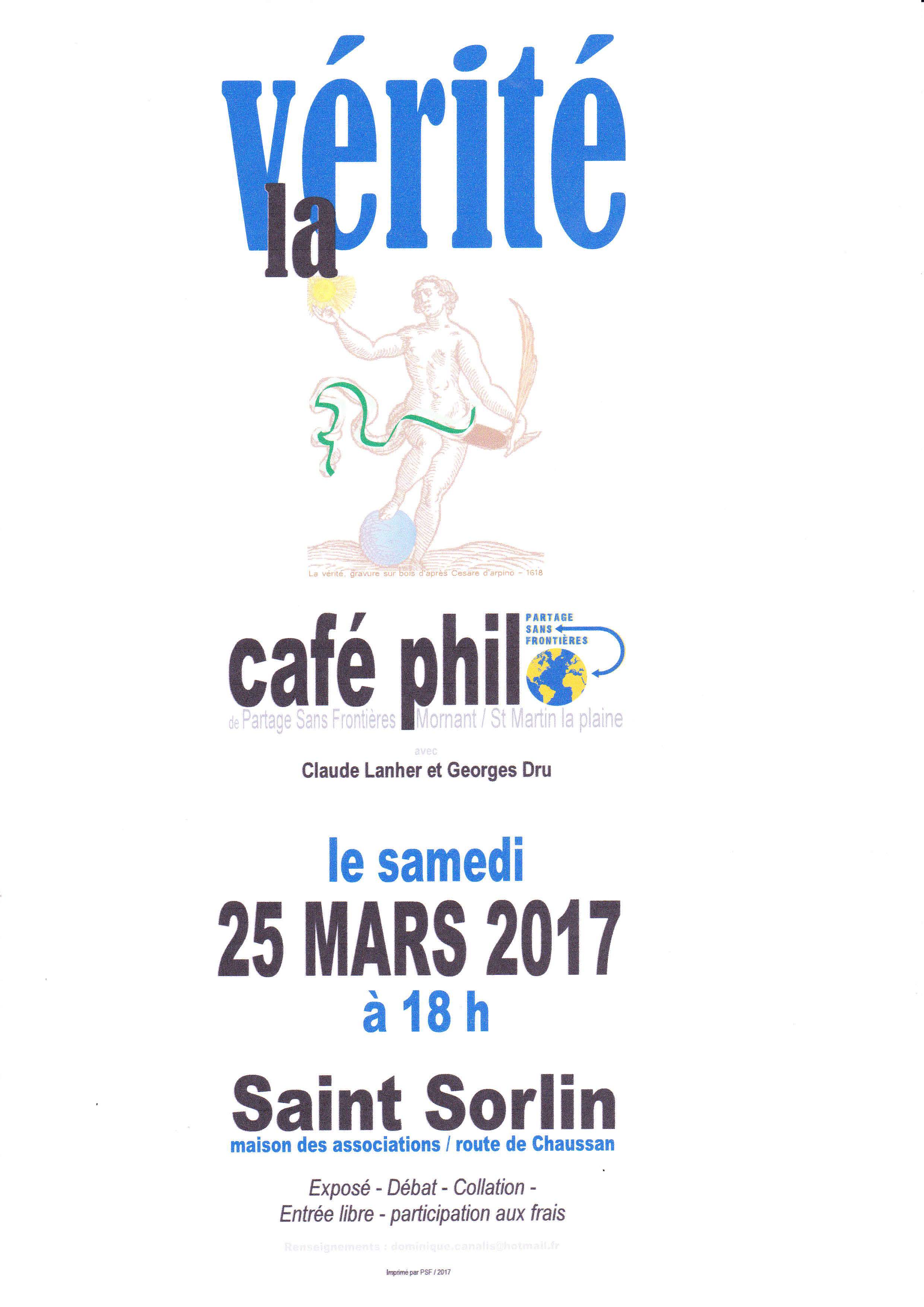 Ouvrir la photo L'antenne Mornant-Saint Martin la Plaine de Partage Sans Frontières vous invite à participer à son café-philo du samedi 25 mars 2017, 18 heures, maison des associations de Saint Sorlin (69440). Le débat, sur le thème "LA VERITE" sera animé par le 25/03/2017 à maison des associations de Saint-Sorlin (69440)