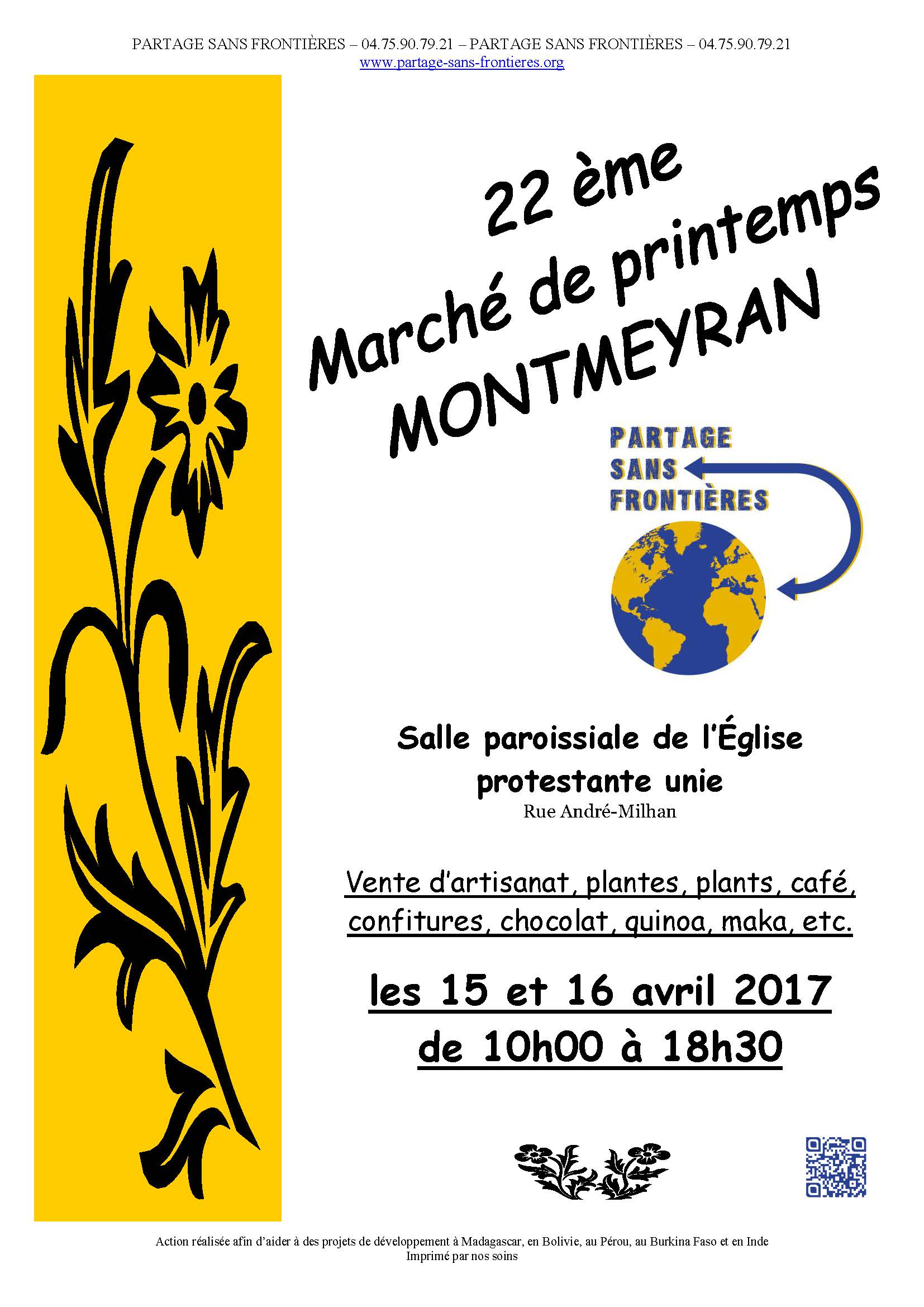 Ouvrir la photo Comme chaque année, et ce depuis 21 ans, nous vous invitons à venir nous rencontrer lors de notre traditionnel marché de printemps. Nous vous attendons nombreuses et et nombreux autour d'une tasse de café ou de thé. Vous aurez l'occasion de marquer votre solidarité du 15/04/2017 au 16/04/2017 Le fichier en PDF à télécharger ... [lire la suite]