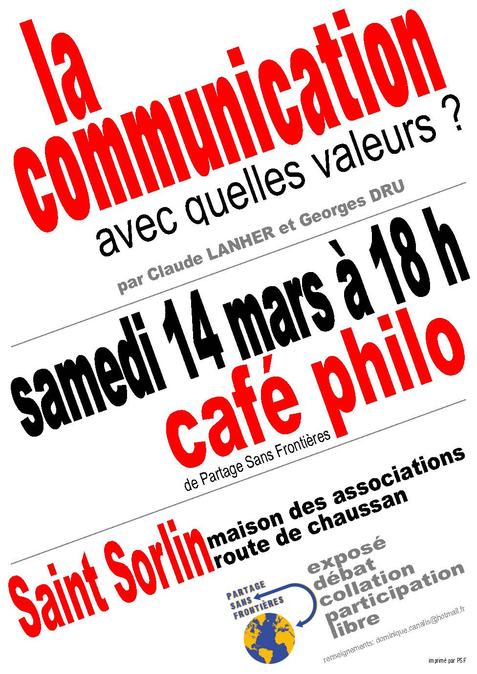 Ouvrir la photo Vous êtes chaleureusement invités au prochain café-philo qui aura lieu à Mornant au profit de Partage sans Frontières. Il aura lieu le samedi 14 mars, à la salle des fêtes de Saint-Sorlin, de 18h30 à 22h environ.Il sera animé par 2 philosophes le 14/03/2015 à Salle des fêtes de Saint-Sorlin