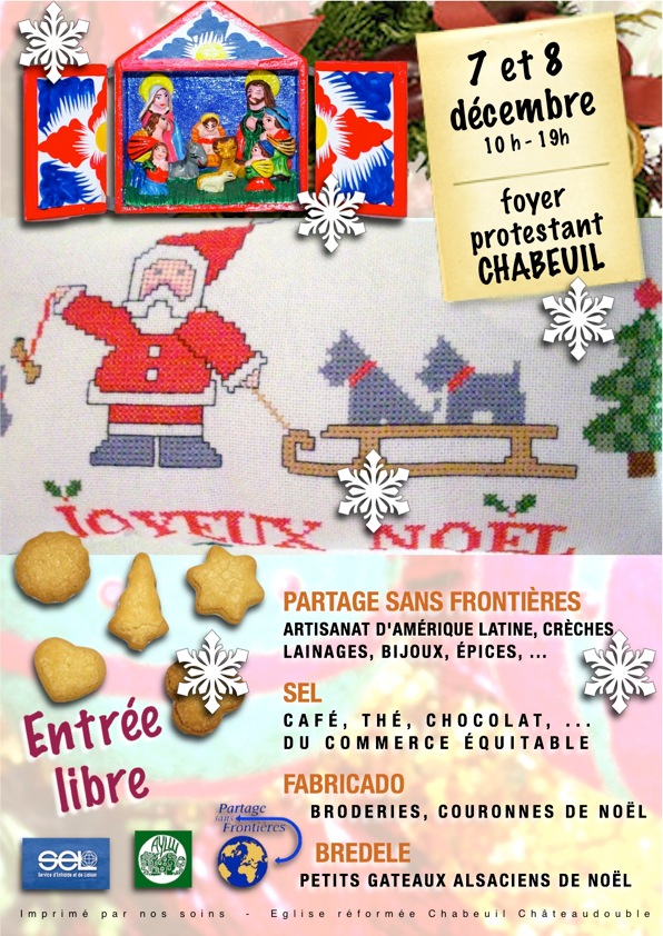 Les 07 et 08 décembre 2013, nous vous proposons notre traditionnel marché solidaire en collaboration avec le Sel et Fabricado, rue de Monchweiler dans la parroisse protestante unie, au foyer.Nous vous y accueillerons chaleureusement et nous pourrons y discuter librement. Artisanat