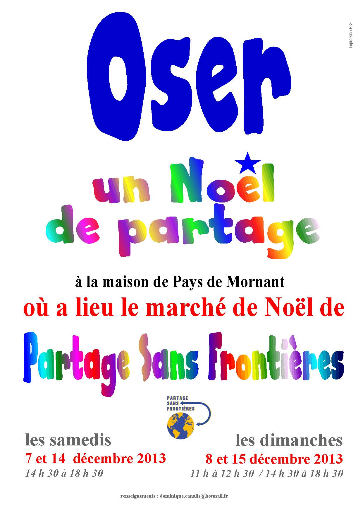 Nous avons le plaisir de vous inviter au marché de Noël de Mornant (69) au profit de Partage sans Frontières.Ce dernier aura lieu les 07-08 et 14-15 décembre 2013Au plaisir de vous y rencontrerVous trouverez Ici l'affiche de présentation du marché au format PDf,