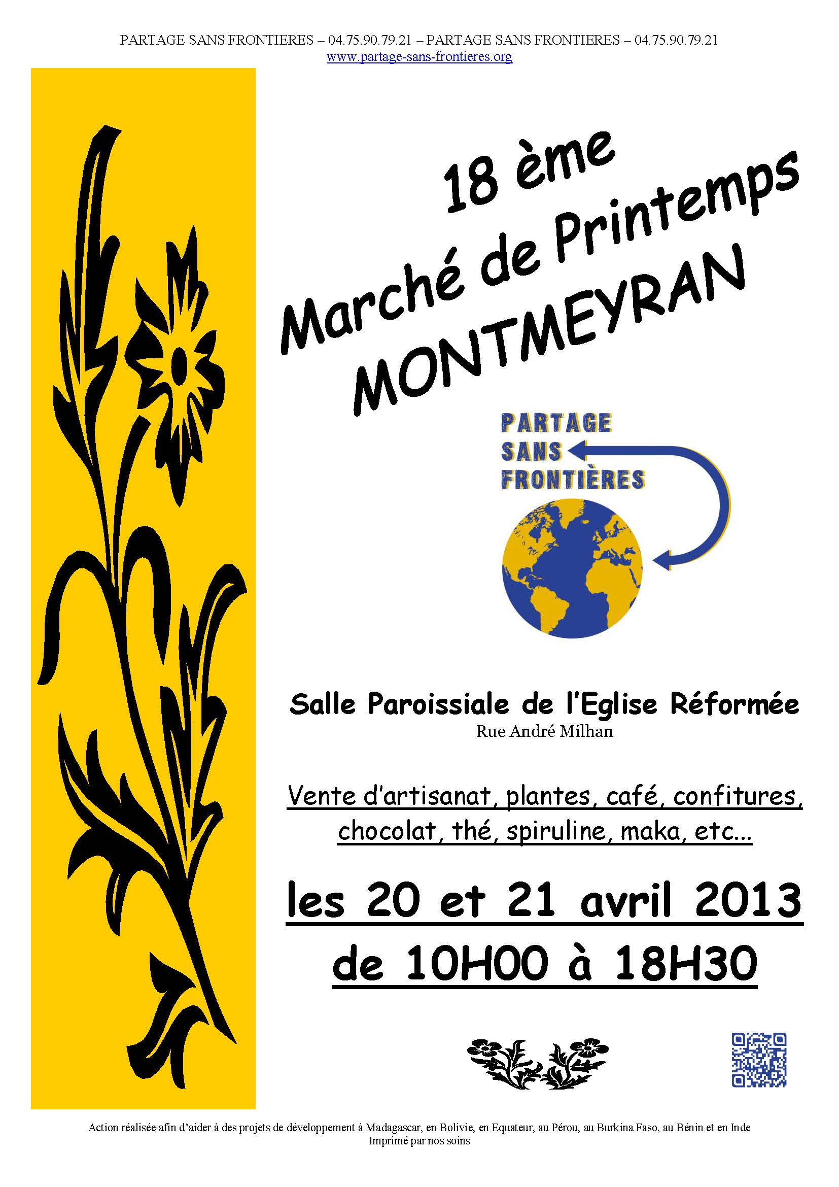 Comme chaque année nous avons le plaisir de vous inviter au marché de printemps 2013, à Montmeyran. Vous y trouverez des fleurs, de l'artisanat et plein de bonnes choses à déguster.