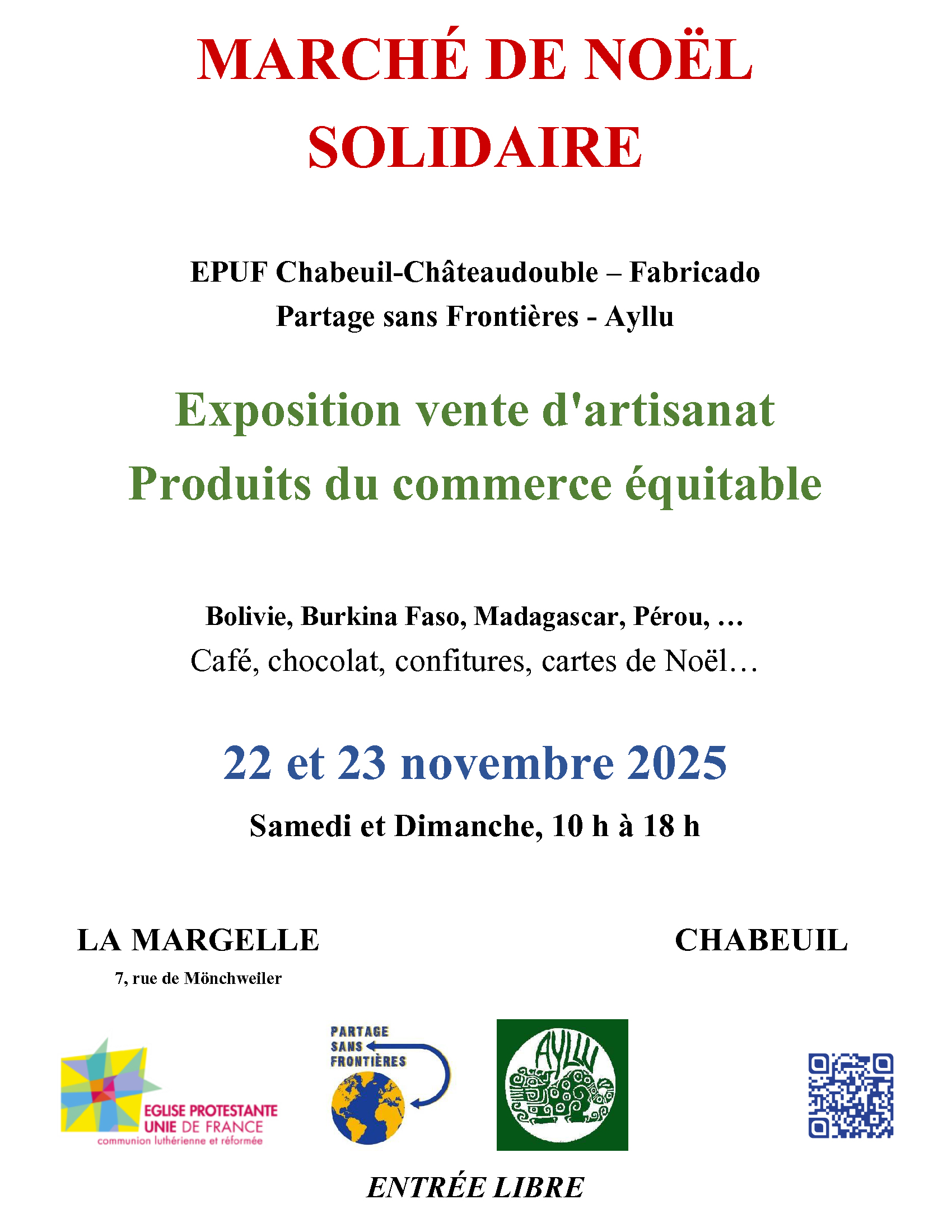 Nous avons la joie de vous inviter à notre traditionnel marché de Noël solidaire de Chabeuil, avec l'Eglise protestante unie de Chabeuil-Châteaudouble, Fabricado, et l'association Ayllu.