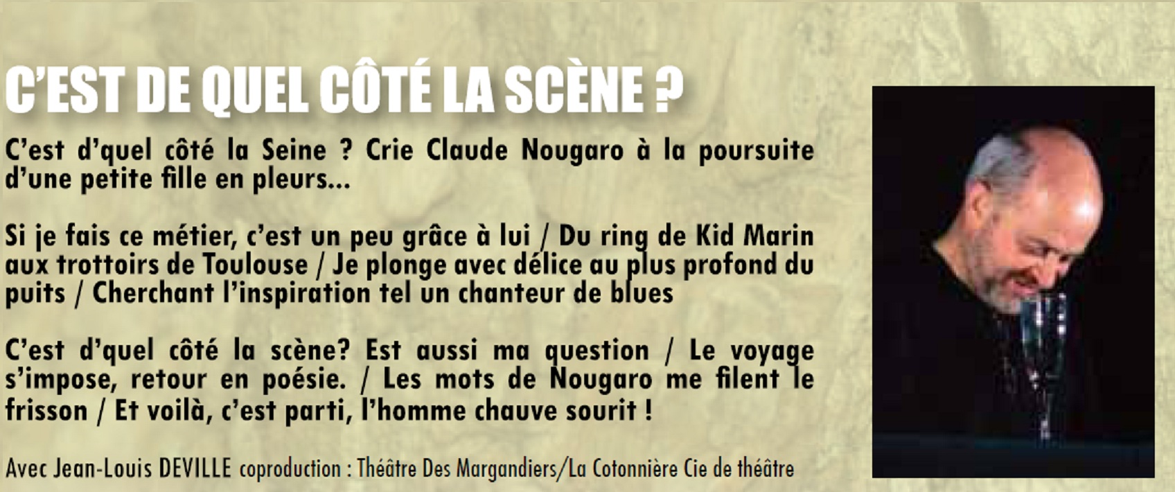Comédien et metteur en scène, j'ai le grand privilège de côtoyer les poètes. De Molière à Dario Fo, de Grunberg à Beaumarchais en passant par Feydeau, Brecht et Woody Allen. J'ai même fréquenté