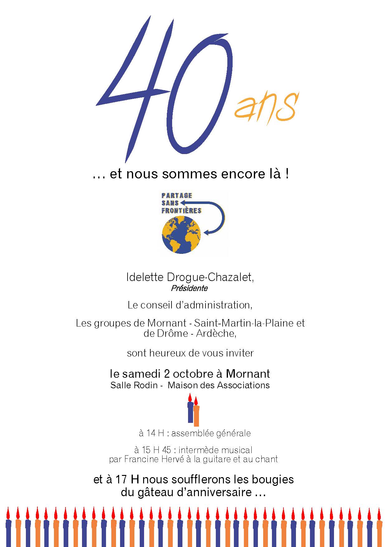 le 10/10/2021 à Salle la Gare, 4 rue René Charre, Saint-Martin-la-Plaine... [lire la suite] Anniversaire des 40 ans de Partage sans Frontières Assemblée générale