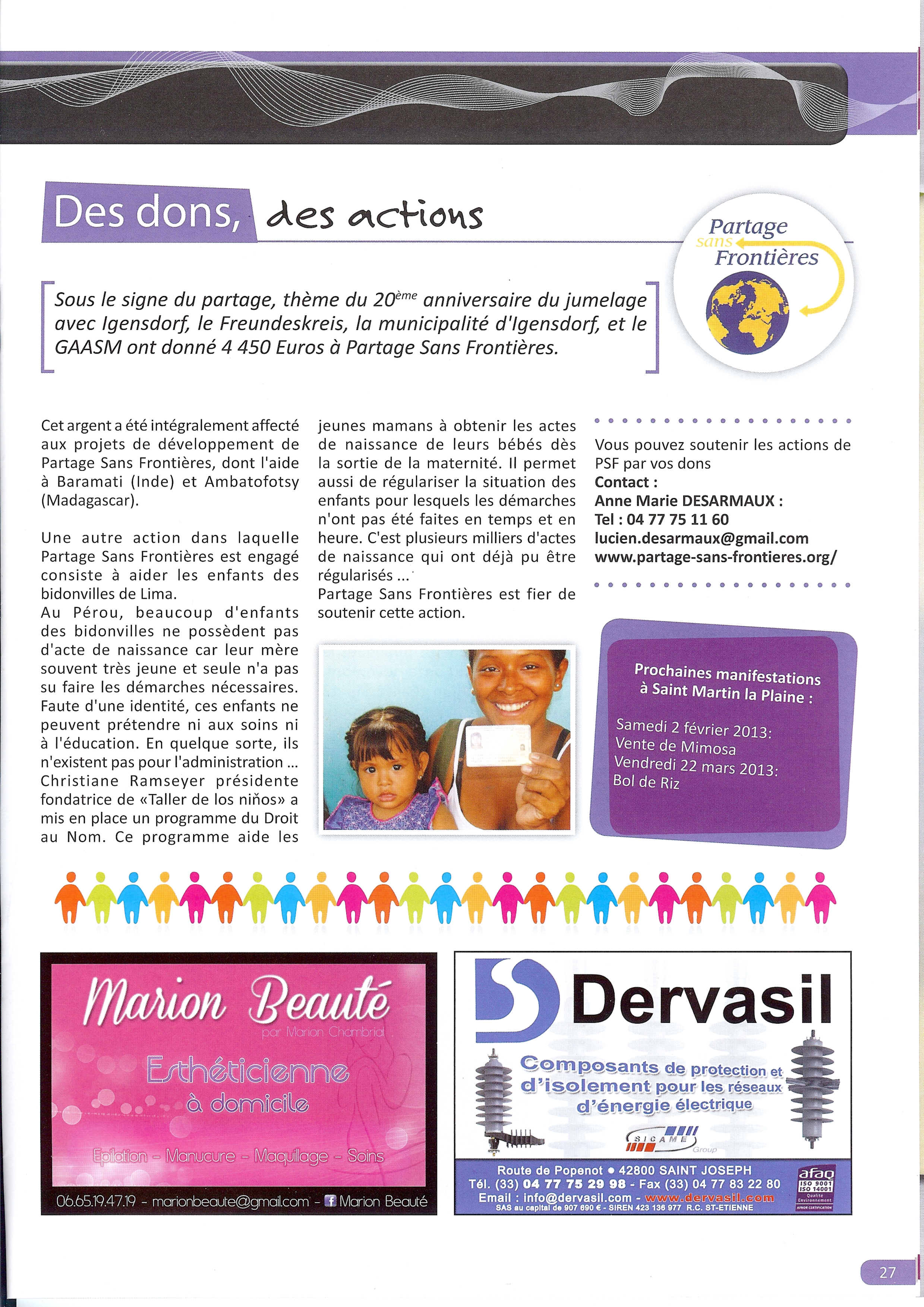 Ouvrir la photo Vous trouverez dans cette nouvelle la page du bulletin municipal de Saint Martin la Plaine de janvier 2013, dédiée à PSF. Nous avons souhaité décrire une action particulière afin de ne pas rester dans les généralités. Merci encore à Le fichier en PDF à télécharger ... [lire la suite]