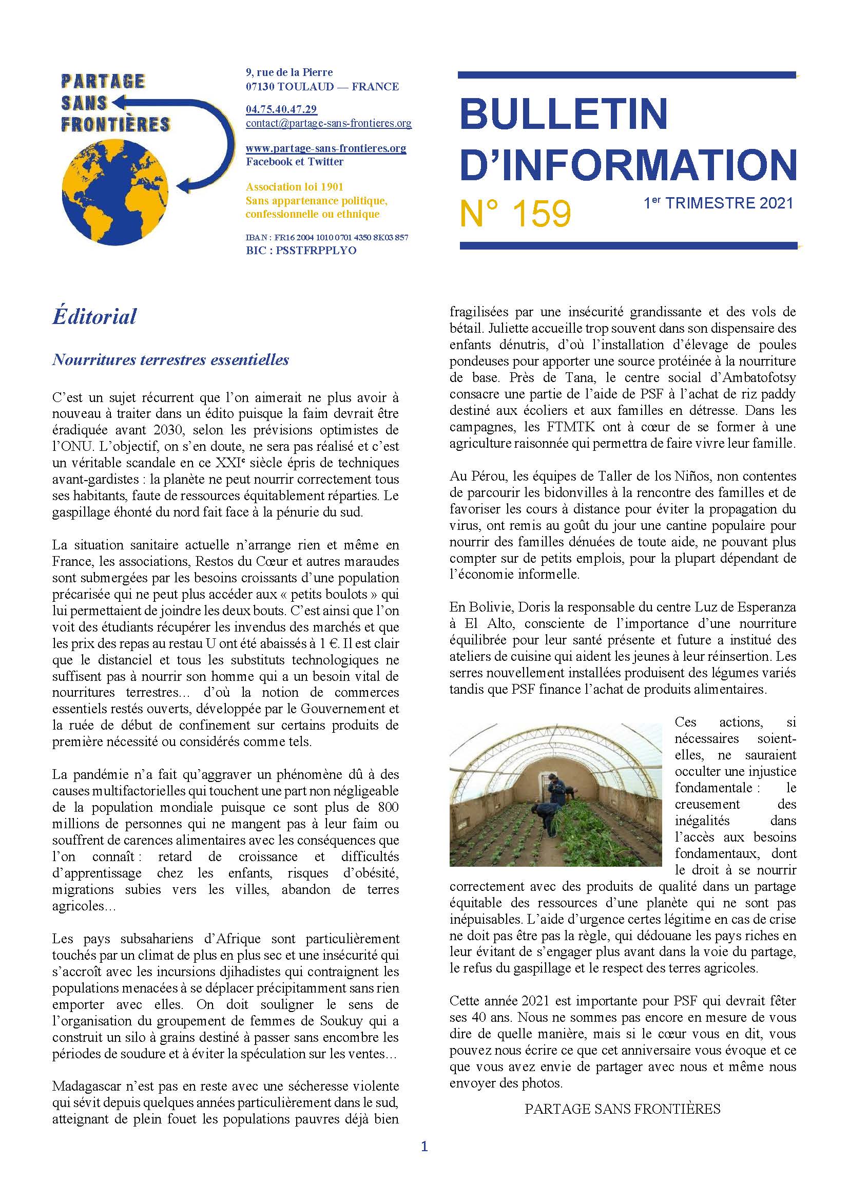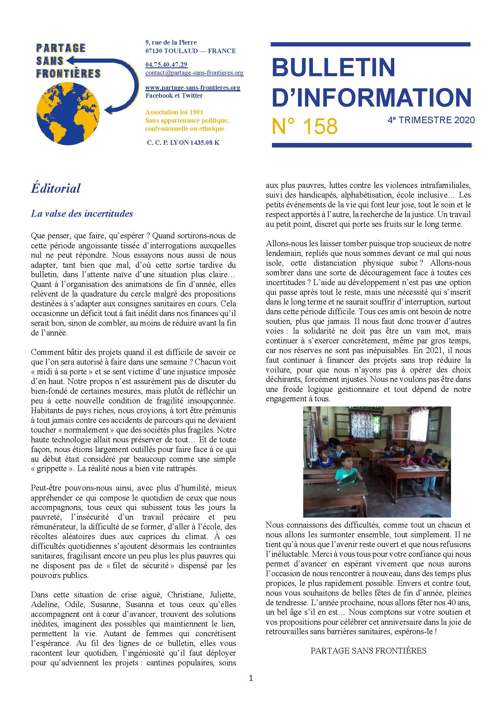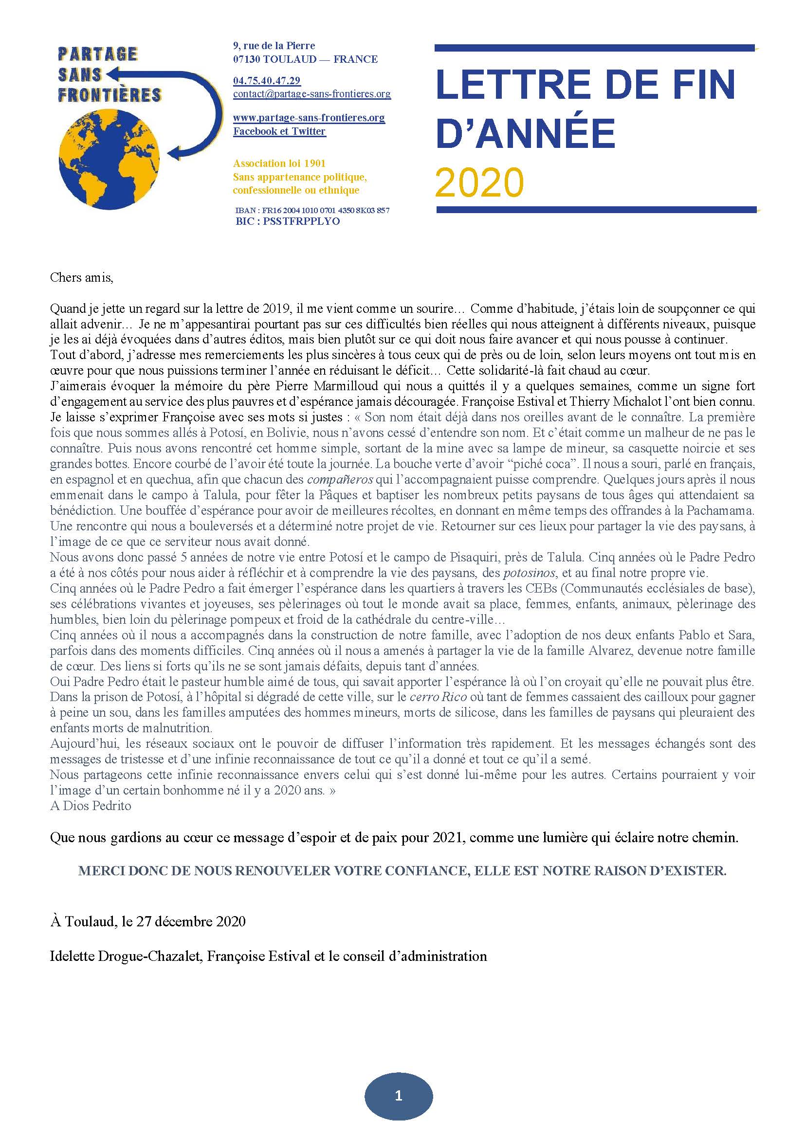La lettre de fin d'année 2020 de Partage sans Frontières