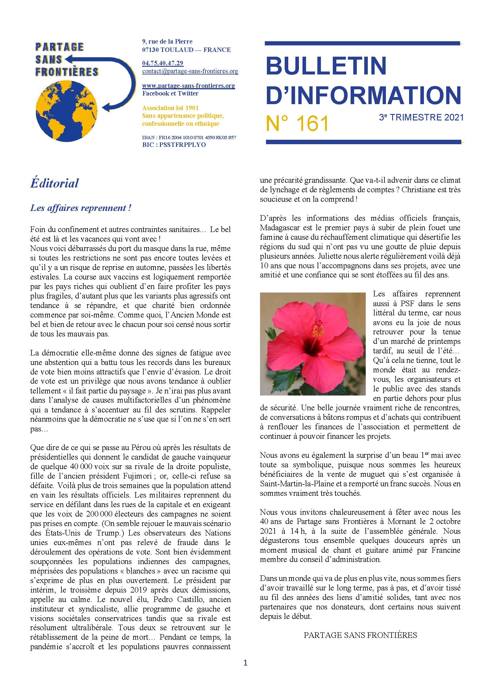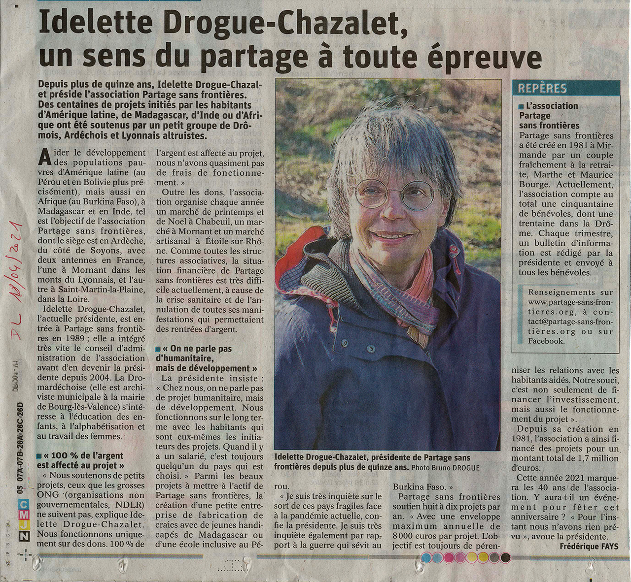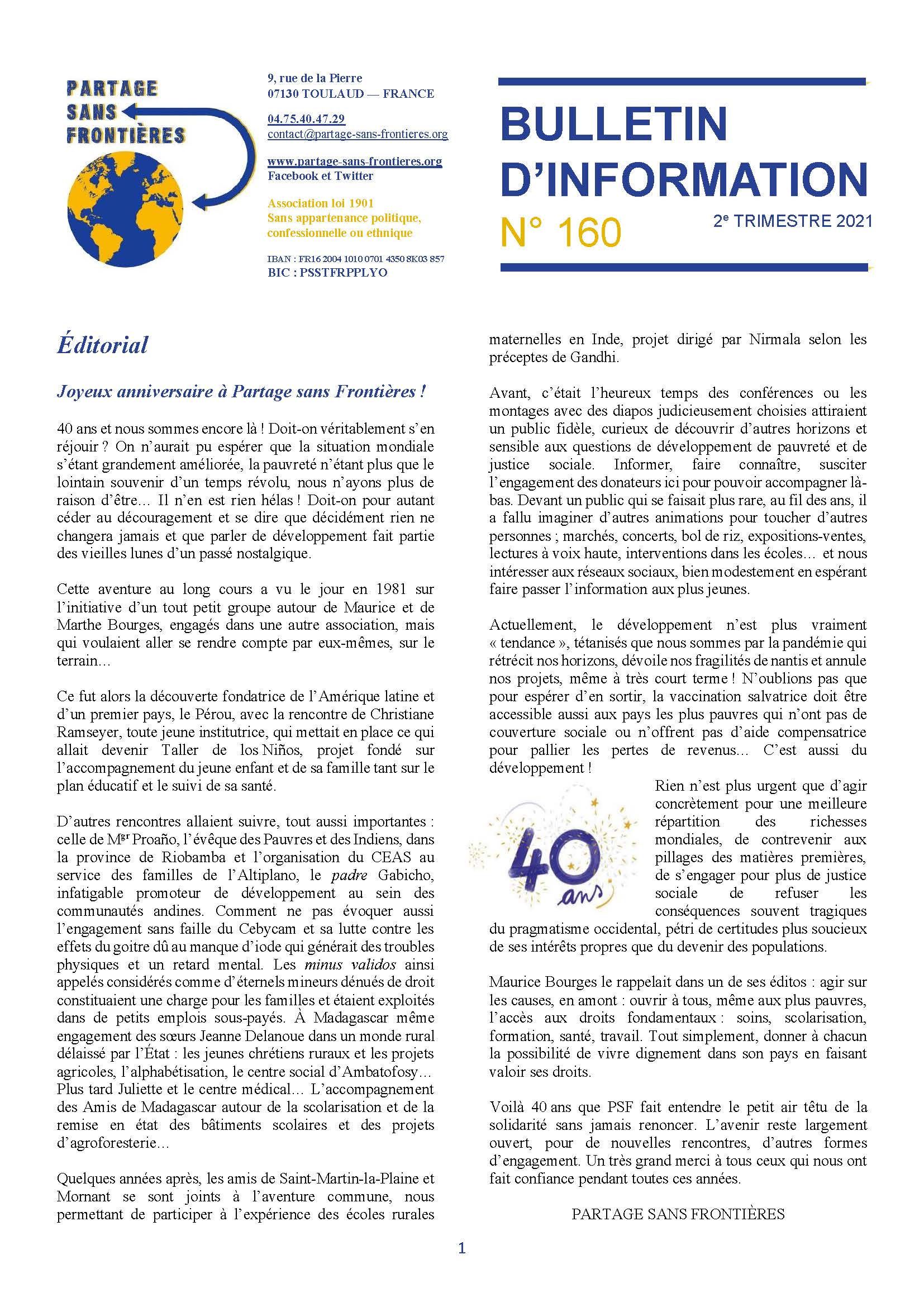 Bulletin 160 des 40 ans de Partage Sans Frontières Un article autour de notre présidente Idelette Drogue-Chazalet